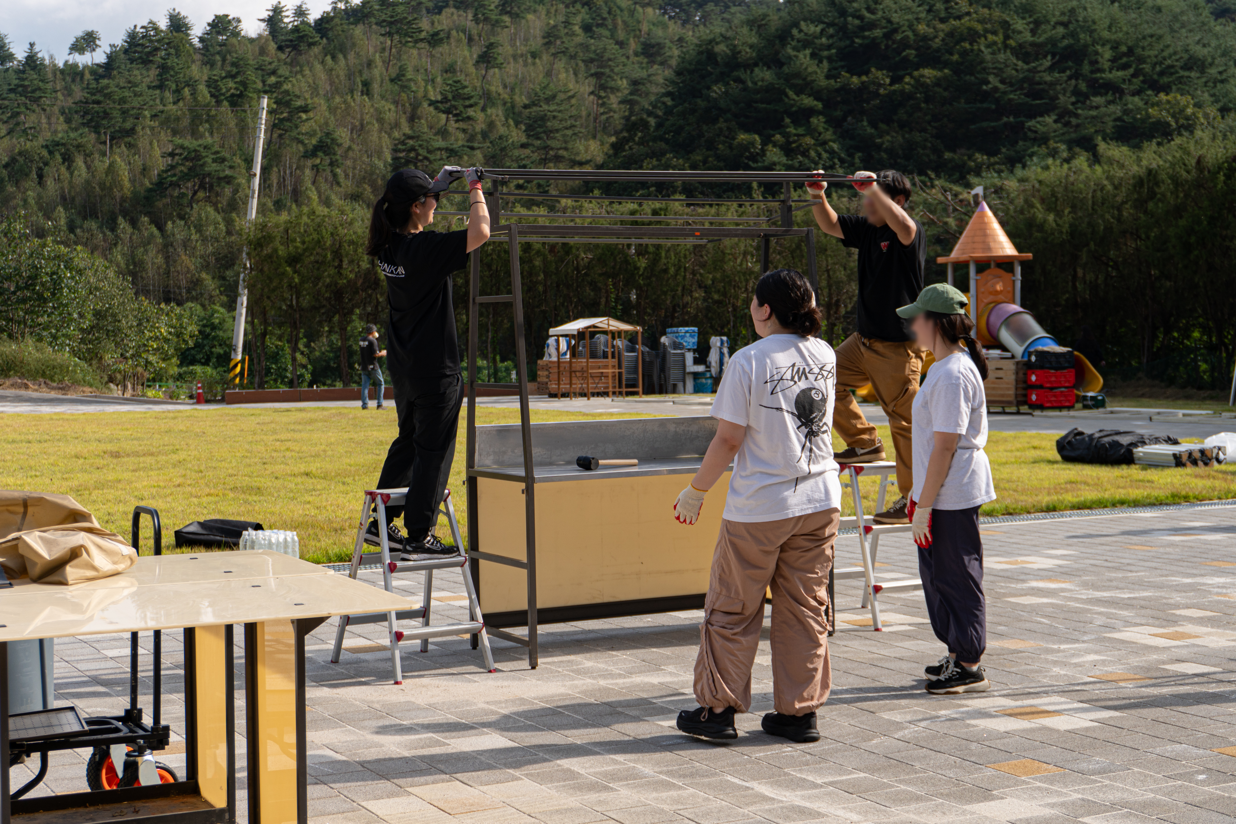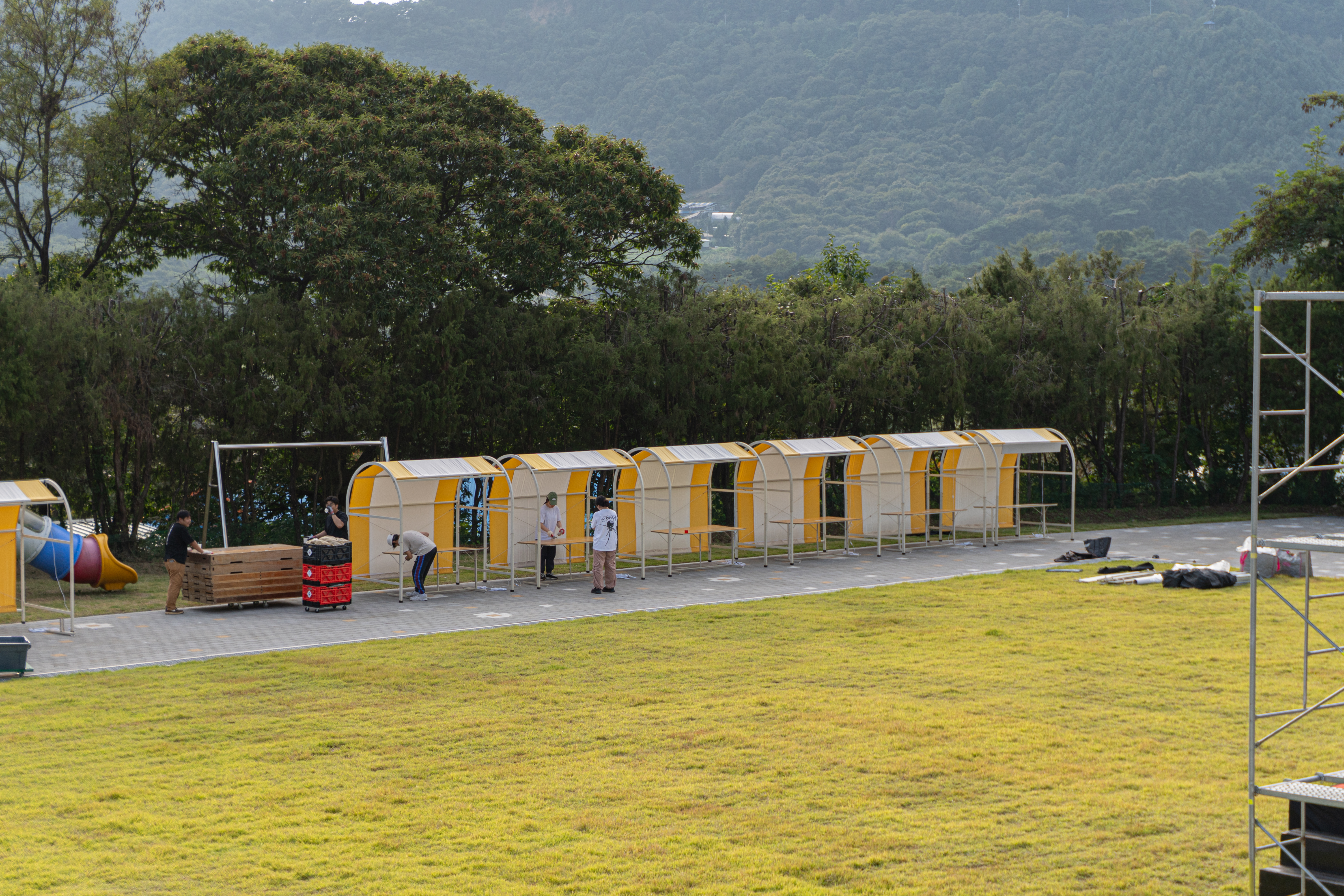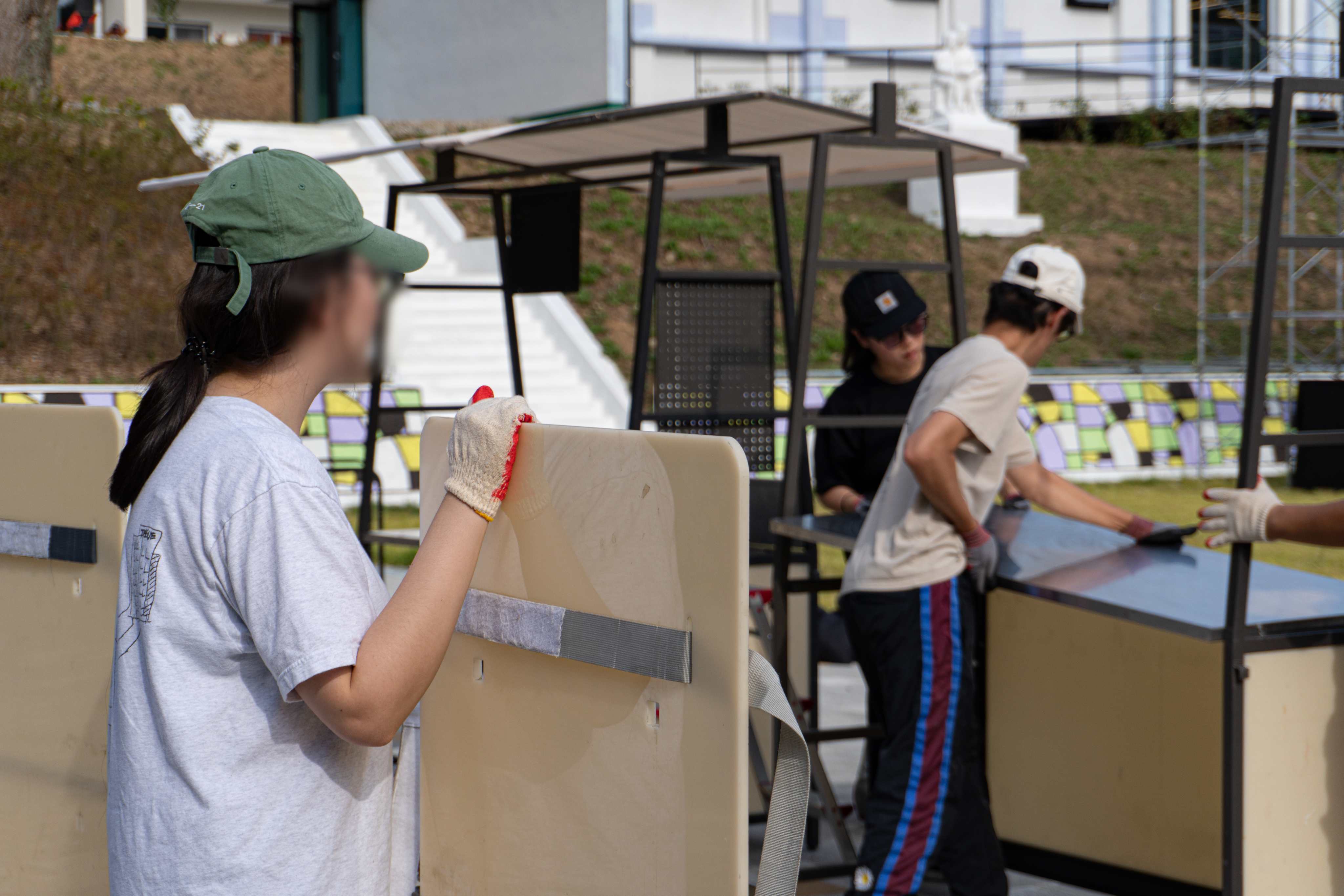 설치가 끝나도 아직 현장은 끝나지 않았다. 렌탈 매니저는 안전을 위해 집기를 하나하나 다시 확인한다. DP Box의 경우 기준점이 되는 다리가 90도로 정확히 서 있는지, 테이블이 일자로 정렬되어 있는지, 지붕 천이 알맞게 부착되어 있는지, 조명이 정중앙에 설치되어 있는지 세심하게 살펴본다. 문제가 발견되면 수정한 뒤 마스킹 테이프로 확인했음을 표시한다.