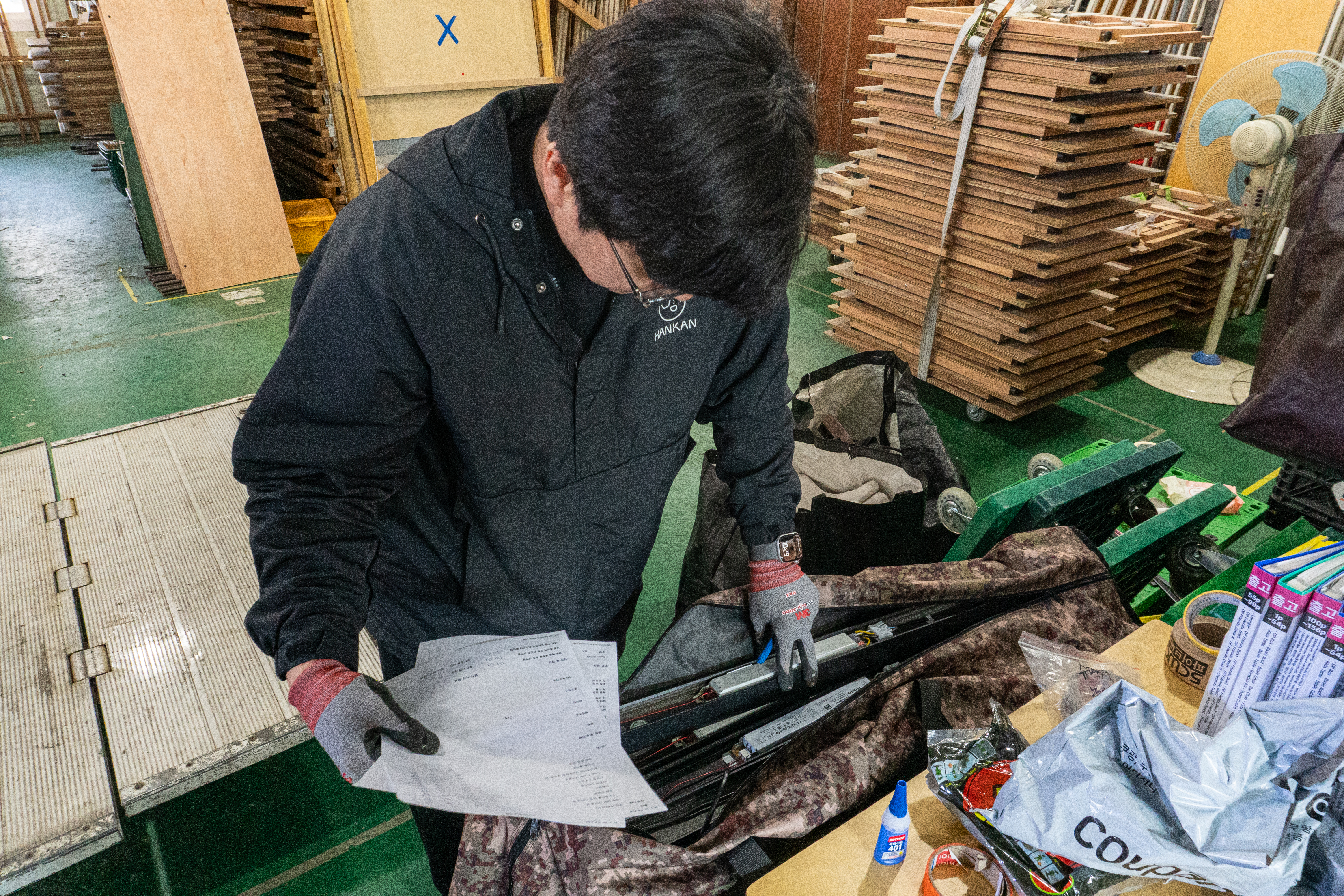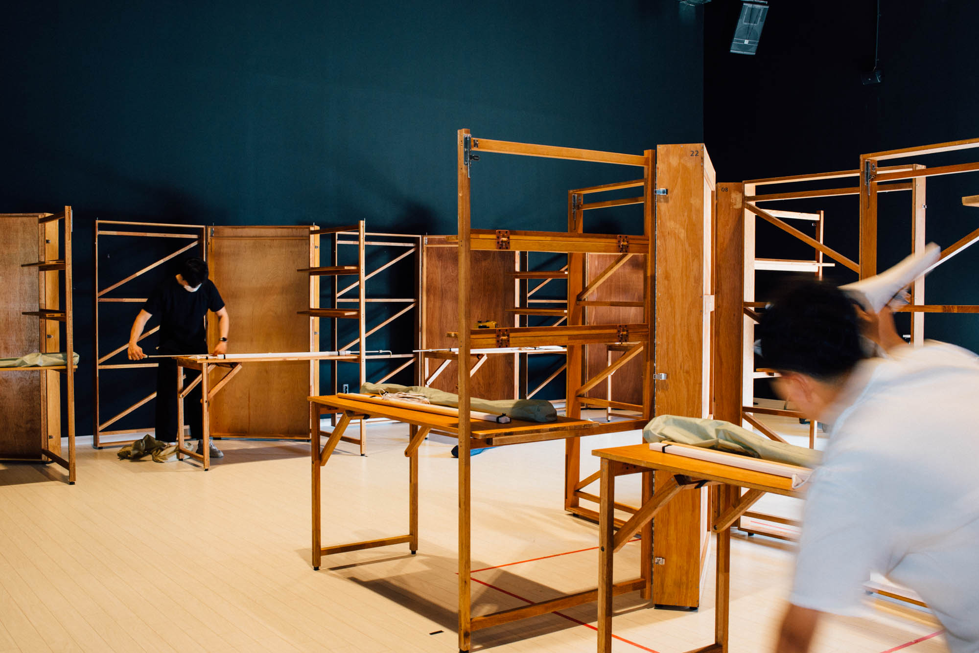 현장에 도착한 렌탈팀은 먼저 담당자와 인사를 나눈 뒤, 배치도를 보며 배치 정보를 현장 상황과 대조한다. 충분한 사전 준비를 거쳤더라도 사전에 전달받은 정보들을 하나씩 되짚어 봐야 한다. 주어진 배치도만 가지고 설치를 시작하면 집기가 공간 안에 물리적으로 들어가지 않는 상황이 발생하기도 한다. 렌탈 매니저는 전체 공간 크기를 측정하고, 배치 위치를 확인한 뒤 바닥에 표시한다. 특히 집기 수량이 많거나 행사 규모가 큰 경우에는 고객과 함께 현장에서 배치를 수정하거나 공간에 맞는 최적의 구성을 다시 만들기도 한다.